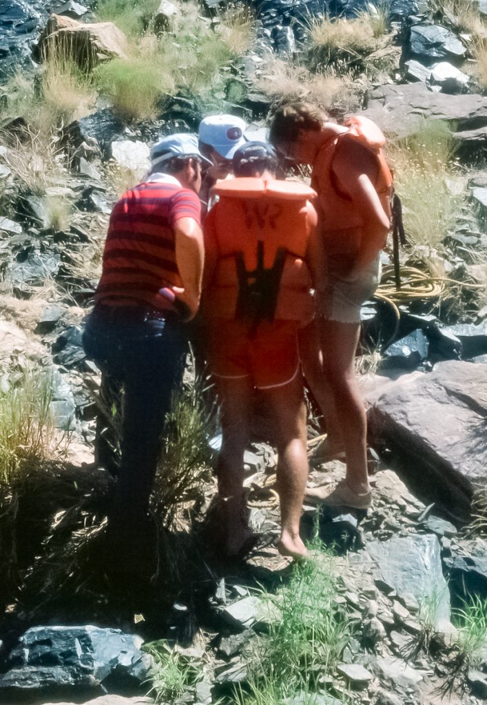 Ken nosed the raft to shore. What could we do to help? They were pilots ferrying a new helicopter to Las Vegas to have navigation avionics installed. Of necessity, they were navigating with only a magnetic compass and map, good enough for a Boy Scout Merit Badge but not equal to the job at hand. They were lost and low on fuel, saw us on the river, and dropped down to get directions. I had a private pilot’s license and was familiar with the navigation maps they were using. We laid out the maps and easily pinpointed the location. They offered profuse thanks and gingerly picked their way up and over the rocky rise and disappeared. In a few minutes the chopper whirred into sight, they gave us a wave and began their climb out of the Canyon.
